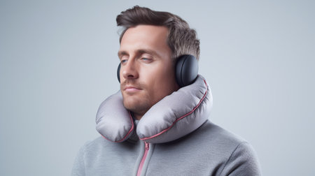 Man Wearing Neck Pillow and Headphones