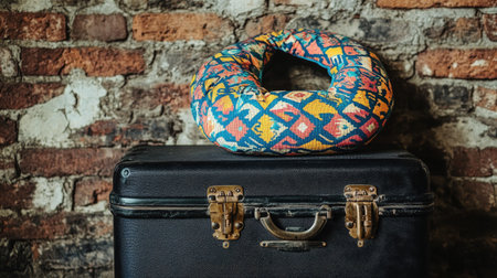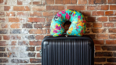 A black suitcase with a vibrant neck pillow resting on top, near a rustic brick wall.