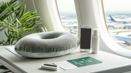 Airport essentials boarding pass, phone, passport, sanitizer, and travel pillow on a tray table