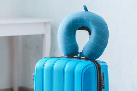 Travel pillow and suitcase in room