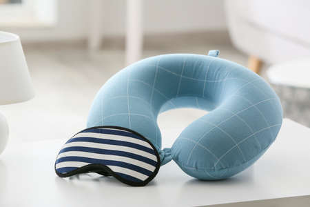 Travel pillow with sleep mask on table in room