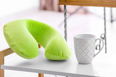 Travel pillow with cup on table in room