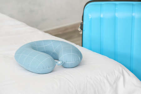 Travel pillow and suitcase in bedroom
