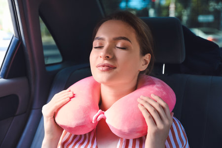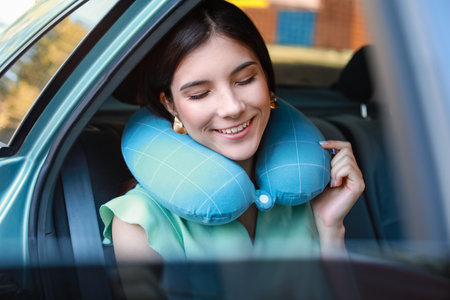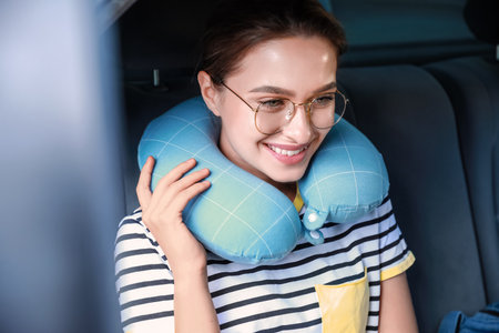 Beautiful young woman with travel pillow sitting in car
