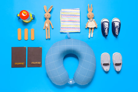 Travel accessories for children on color background