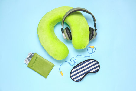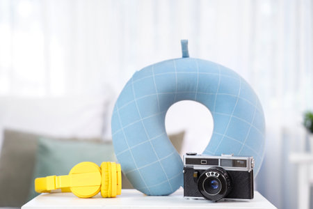 Neck pillow, headphones and camera in room. Travel concept