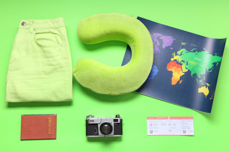 Travel pillow, photo camera, passport, ticket and beach accessories on green background