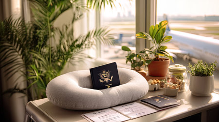A serene travel scene featuring a passport resting on a cozy pillow, complemented by indoor plants and an inviting airport backdrop, perfect for wanderlust.