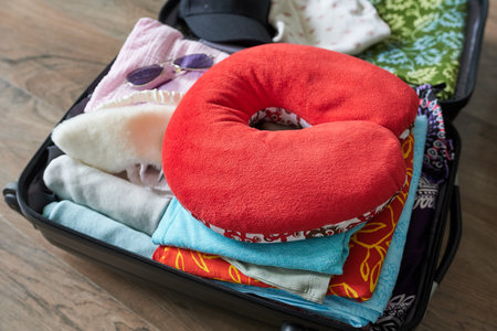Packed suitcase and travel pillow at home