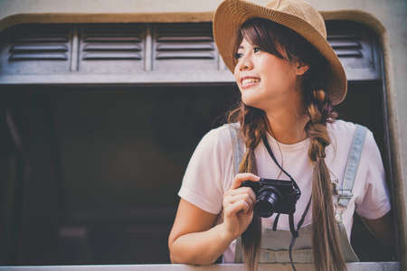 Portrait of an Asian woman smiling and take photo at the train station. Tourism concept