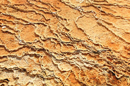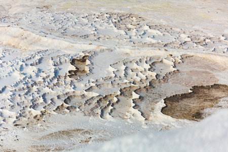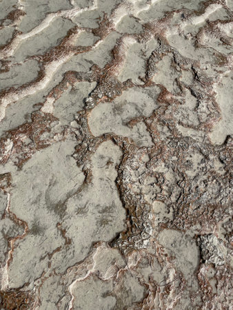 a high angle close up shot of mineral terraces at mammoth hot springs in yellowstone national park, usa