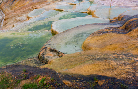 Above view of geological formed pools and terraces. a textured background of carbonated minerals and calcium in a natural basin with hot springs after flowing thermal spring water. Travel and tourism