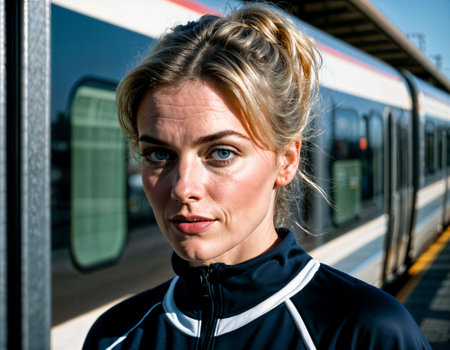 photo of middle aged woman with tracksuit sports standing in front of metro train station , generative AI