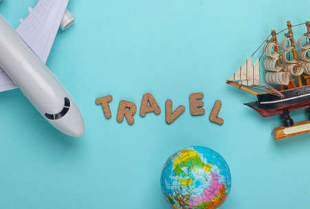 Travel concept. Figurine of a passenger plane, ship, globe on blue background. Top view