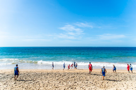 Salvador, Bahia, Brazil - February 20, 2022: Men playing beach soccer at Farol da Barra beach front in Salvador city, Bahia, Brazil.
