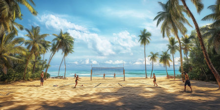 A volleyball court on a sandy beach, with players in action and palm trees swaying in the background