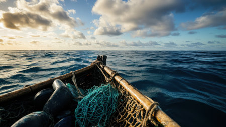 A fishing net rests atop a boat as it drifts in the vast ocean, awaiting the next catch.