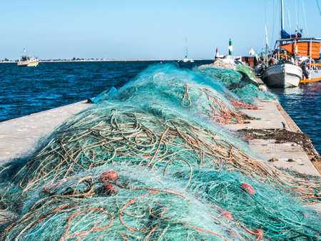 Fishing nets and boats in the harbor at sunset. Selective focus.