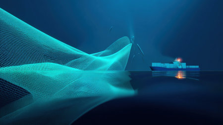 An underwater perspective of the sonar net as it interacts with marine life depicting the technologys role in ensuring safe navigation for cargo ships above the surface
