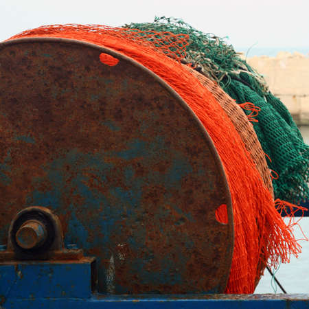 Fishing boats in the sea at sunrise, fishing nets close-up
