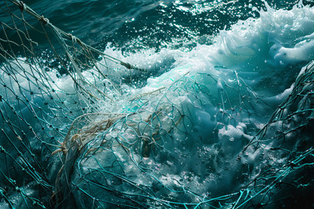 Green fishing nets are submerged in deep blue ocean water, with white waves crashing over them.