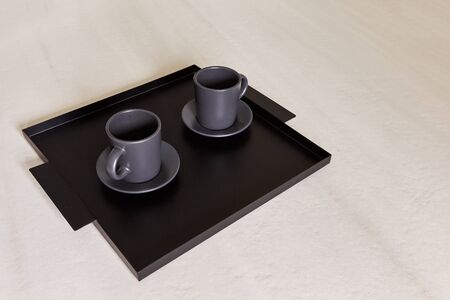 two black cups stand on a tray on a light table