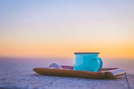 Cute blue cup of coffee placed on the terrace outside next to morning sky. Sea spa resort early breakfast.