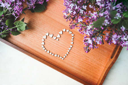 arge heart consisting of small wooden hearts on a wooden tray with lush bouquets of purple lilac, top view, decoration of a cozy home, romantic Breakfast