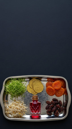 A vertical, tall 9:16 stock photograph showing a close-up, centered flat lay of a reflective silver