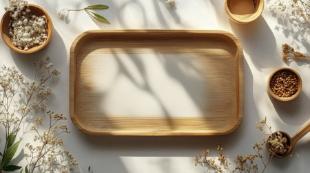 A rustic wooden tray holds a glass jar filled with dried flowers, casting delicate shadows on a sunlit table, creating a warm and inviting atmosphere in a cozy room.
