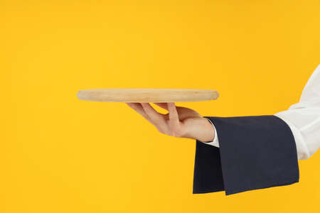 Male hand of waiter holds empty tray on yellow background