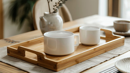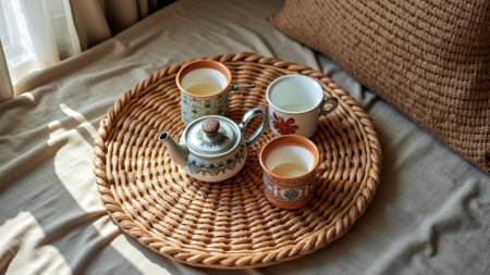 Cozy morning tea: ceramic teapot and cups on woven tray by sunny window. That the image is generated using AI.