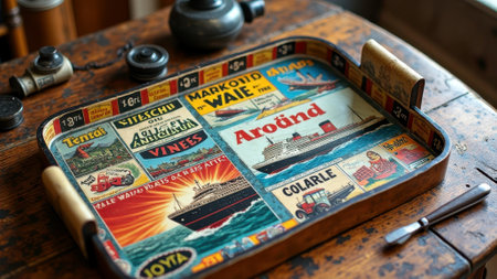 Vintage advertising tray with retro art and nautical theme on wooden table. That the image is generated using AI.