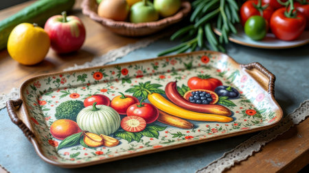 Vibrant ceramic tray with assorted fresh fruits and vegetables on rustic table.