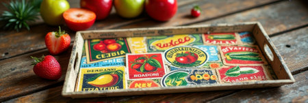 Vintage tray with colorful fruit labels on rustic wood table.
