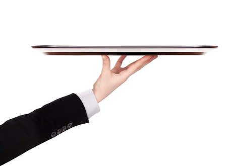 waiter holding empty silver tray isolated on a white background