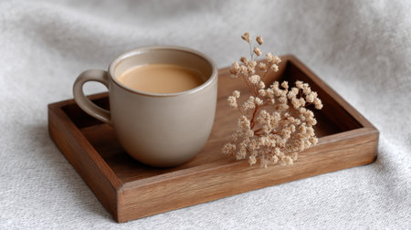 A warm cup of coffee rests on a wooden tray, accompanied by delicate dried flowers, bringing a cozy and inviting touch to any serene setting, perfect for moments of reflection.