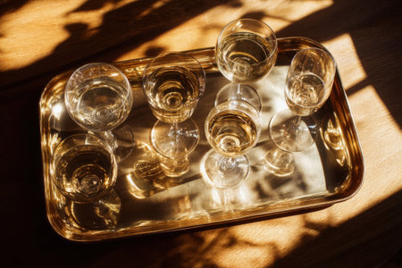 overhead shot of multiple champagne glasses on a tray with golden reflections, styled for a party setting, high contrast shadows v 7, Generative AI