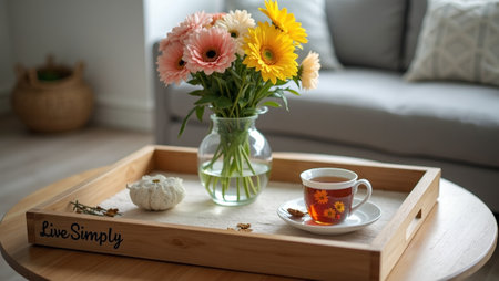 Cozy living room decor with Live Simply tray fresh flowers and tea cup