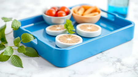 Healthy lunch box with lemons tomatoes and herbs on white marble table.
