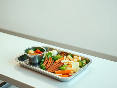 Healthy food in lunch box on white table with copy space.