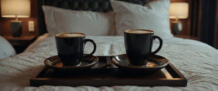 AI Generated. Two cups of hot coffee on a tray in bed in a cozy interior Room service at the hotel