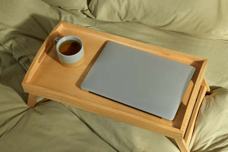 Wooden tray with modern laptop and cup of aromatic tea on bed indoors, above view
