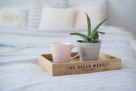 Coffee cup with aloe vera plant on wooden tray in the bedroom