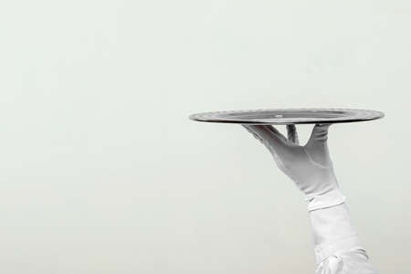 The waiter's hand in white gloves holds a silver tray. Isolate on a light background