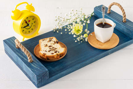 Slices of pound cake with raisins and a cup of coffee served on a tray. Morning tasty breakfast.