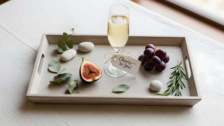 A wooden serving tray holds a glass of champagne, a fresh fig, a bunch of red grapes, and a gift tag that reads 'Cheers to You!'. The arrangement suggests a celebratory welcome amenity or a relaxing treat in a hotel or home setting.
