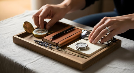 Hands arranging a collection of vintage items including a compass, pocket watch, notebook, and glasses on a wooden tray. Dried lavender adds a touch of aesthetic detail to this organizational still life.