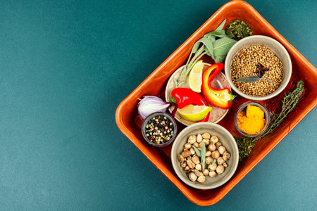 Kitchen set of spices, herbs, sauces and seasonings for cooking. Copy space.