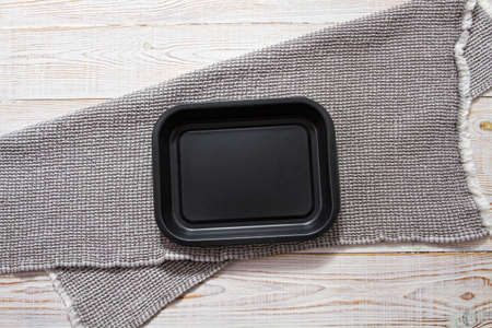 Empty baking tray with pink tablecloth top view on table